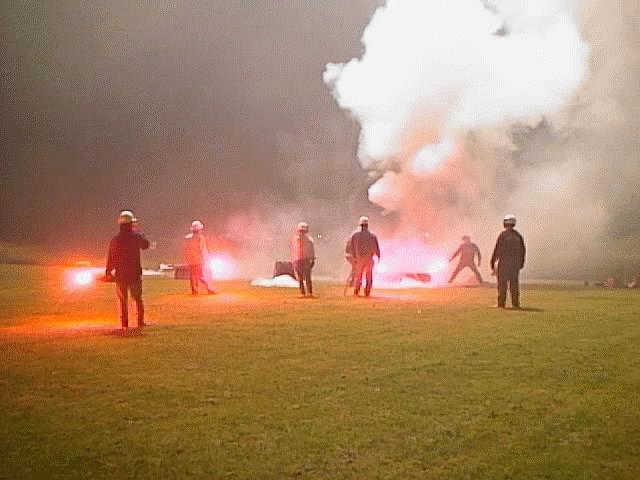 9:18 - The firemen start lighting flares - common red, roadside flares, about eighteen inches long. They put six flares on the ground along the front tubes to light our stage, then each fireman lights a flare to use for lighting fuses. Each time a flare is lit, the audience frenzy builds.