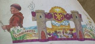 Frames are made for the trailers - a float may have as many as five trailers, each 25' to 55' long. To make turns easier, some floats have cables which make the rear wheels steer in the opposite direction as the front wheels. This frame is then "bucked" with wood studs to form the float, then covered with a "skin" of plywood, canvas, urathane or a combination of the three.