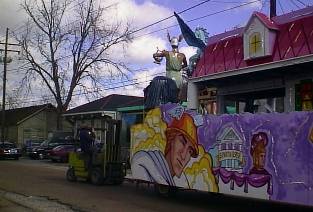Glittering touches, like gold foil, are added, as well as lighting, fringe and giant flowers. Then the final hardware is attached, such as the lean-rail/bead holders, the outhouse and the all important, "keep-the-drunk-person-from-flying-off-the-float" safety hooks.
