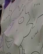 The skin is made lumpy to give it a third dimension, and is whited-out with heavy, white paint. A float artist then uses charcoal to "lay-out" the artwork and notate what colors should go where, making the project resemble a giant paint-by-number coloring book.
