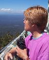 Cathi Lane scans the forest toward Mt. Shasta.