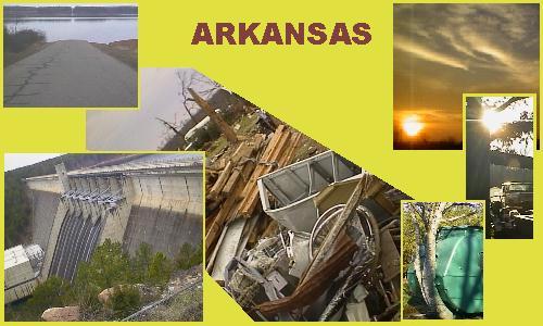 (Counter-Clockwise, from top, left) - Dammit! Where's the road? This road, near Heber Springs, disappeared when they built the dam, below. ::: Damage from a twister, near Floral. They're so common around here, they call the part of the state "Tornado Alley." ::: A tree grows around a camper at a hunting camp. ::: Sunrise at Fisher Camp. ::: The requisite sunset.