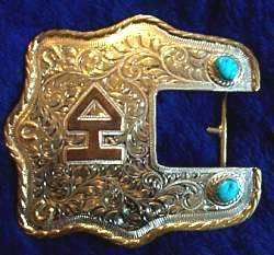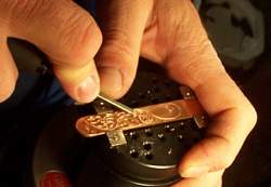 Hunched over the vise, Howard focuses intently on his subject. With a heavy, leather glove protecting his left hand, he uses a small chisel in his right. He carves out the edges of leaves, using a "wriggle" stroke, so named because he gently rotates his hand - and the chisel - along the metal. This creates an outline of paisley designs. He then uses a pneumatic graver to carve leaves inside, in a process called "western bright cutting." He uses a narrower graver, called a "liner" to give the artwork shading. He will cover the entire buckle with either engravings, logos, braids or stones (usually turquoise.) Howard finishes the buckle by polishing it on a high-speed wheel.
