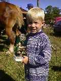 In their third attempts, Larry Reed pulls the boat only seven inches, and Randy Hall pulls it one foot, eight inches. Joe Harrison, with his team of Belgian horses wins his fifteenth Heavyweight Horse Pull out of seventeen. Harrison brings his team to the center of the tugline and recieves a winner's purse of $400. An official gives his son, Cote, the first place trophy.