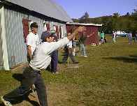 The first round goes quickly, with each team dragging the boat - about the weight of a pickup truck - right across the limestone track. These guys even make this look easy. The track, or "tug line" is eighteen feet wide, marked by ropes pinned to the ground, and the team must stay inside the tug line. After each round a man with a tractor loads another barrel on the boat.