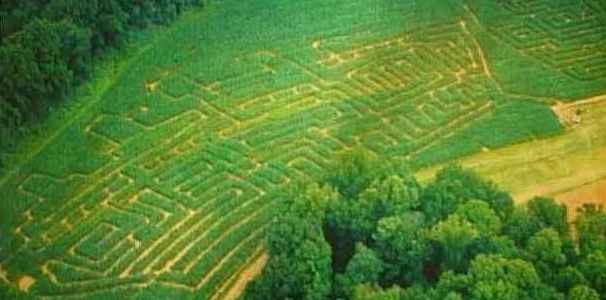 A maze is a labyrinth using large plants, usually hedges, to make a winding, confusing pathway that sends you every which way before it sends you right again. These days, they just cut a path through a cornfield. Sure, it wastes a lot of seed, but it's still great fun and you can make a different one each year.
