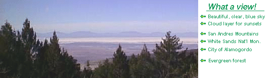 As a student at Berkley in the late sixties, Stephen Keil earned a Bachelor's degree in physics. A space science teacher inspired him to take his physics studies to the stars, and he went on to earn a doctorate in astrophysics at Boston University. In 1973 he interned at Sunspot and "fell in love with the place." Sunspot is a beautiful, rustic facility, with about a dozen modest, military buildings set in a peaceful, alpine wilderness, sixteen miles from the quaint mountain resort town of Cloudcroft, and over forty miles from the military town of Alamogordo. Keil couldn't stay in this haven, however, and he worked a few other jobs before returning. Keil began his astrophysics career with a team of scientists who were trying to revise Albert Einstein's Theory of Relativity because of new discoveries about the shape of the Sun. They had discovered that the Sun is not perfectly round, and I guess that set a group of Princeton scientists into a frenzy of doing huge math problems in their heads and gazing at doughnuts. It was here that Keil discovered one thing; he enjoyed staring at the Sun. "What we've really discovered in the past decade or two is that the interaction between the sun's non-uniform rotation, turbulent motions and magnetic fields drives the many forms of solar activity," says Keil. They are actually probing the interior of the Sun, using seismic techniques similar to earthquake studies on Earth. "We're trying to understand why the output of the sun and the levels of solar activity are constantly changing." In the late seventies, Keil worked in Australia for a few years, and he returned to Sunspot to raise a family. His wife teaches calculus at Alamogordo High School, their son is a senior at AHS and they have a daughter in college. When he isn't studying the center of our universe, Keil can be found exploring the wilds of the Sacramento range on his mountain bike or on cross country skis. To work in a place like this, with fewer than 100 residents who are mostly scientists, you don't really have to be a "people person" but it helps. Staying friendly and quiet is a big plus, making enemies is a big minus - with only 74 people in your world, you can't spare many friends. There are a few dozen children living in Sunspot - they are bused to schools down the mountain - and the population tends to stay very constant ("stagnant" Keil puts it.) But these are patient people, studying an object billions of years old and living atop a mountain. They do like to have fun. Halloween is spooky, but safe in this closed community, and holidays are celebrated with parties and special dinners. You can usually predict who will attend (and probably what they'll be wearing.) The "Peyton Place" syndrome is dampened by the fact that most residents are scientists and are preoccupied with the Ball Of Fire most of the time. The Sunspotians are not completely isolated, however. The campus is a popular tourist stop, with a busy visitor's center. Also, scientists from around the world visit for weeks at a time to use the facility for their experiments. When Keil wonders if life in this uncommon community is really worth the isolation, all he needs to do is walk behind the Hilltop Dome and take in the view.