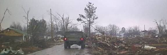 Rick Peson was so close to the twisters that he could hear the howl. "I stood out in my front yard and watched them hit," he says. "I was wondering when they were gonna hit my house." He was one of the lucky ones in Beebe {pronounced "Bee-bee") whose house was unscathed. The town was one of the worst hit outside of Little Rock, and residents even had the uncertain pleasure of a Presidential visit - why, just a week ago, a visit to this little town of 5,000 people, by the President of the United States would have been a major, once-in-a-lifetime event. Today, people are just trying to find their underwear.