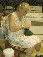This is tedious work, and it helps to be patient. When the strain of standing over a chair becomes too much, Linda will sit and knit an afghan. She has made several of these, which their aunt, Evelyn, has raffled off at a local factory.
