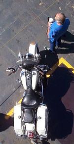 As we set sail from Anacortes, Washington, a passenger enjoys a cup of coffee next to Bob, the Harley, on board the M.V. Yakima. There are 172 San Juan islands, but I will visit only three. Many people mill about the viewing decks and in the cabins, and I meet someone on the upper deck who is going to a wedding on Lopez. Below deck, some people sit in their cars - must be residents, who have taken this ride so many times, they're actually bored with the view.