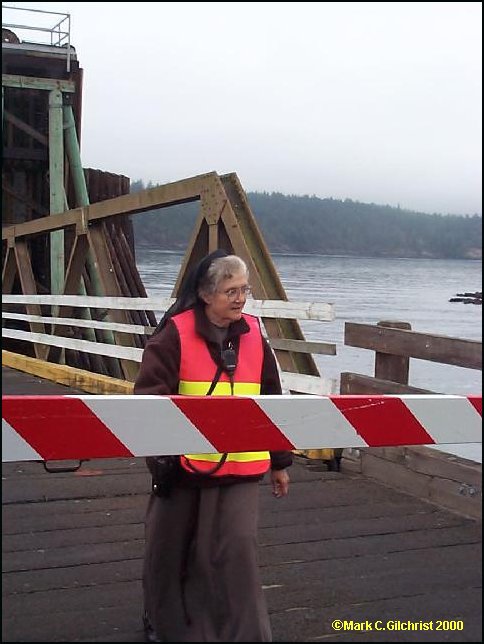 After a 45-minute ride, we arrive at Shaw Island, home to only a few hundred people (including Bill Gates' father, sometimes.) We are greeted at the Shaw Island dock by a sister of the Franciscan convent there. The sister doesn't bless us weary travelers - not formally, at least - and she doesn't even lead us in song. These fine ladies take turns, each time a ferry boat arrives, at donning a reflective vest and 2-way radio, walking out on the dock, and lowering the hydraulic-operated, steel gangplank onto the deck of the ship.