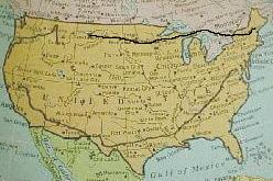 A map from their trip scrapbook shows the route Lucy Woodward (nee Leaf) and Karla Edmunds took from Maine to Montana and the route Lucy took around the rest of the United States.