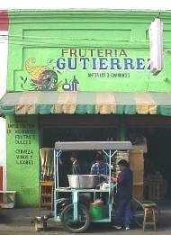 I am at a severe disadvantage here, because I have "rich American tourist" stamped on my forehead (guys are still offering me chiquitas) and I don't speak a word of Spanish, other than "taco" and "burrito" which I suspect aren't even real Spanish, but some Tex-Mex concoction. OK, I can blurt out "Quanto?" and I can count to, oh, thirteen or so in Spanish, but I can't count to "a dollar-seventy-five" or understand more than one word at a time. If I could just get one of those chiquitas to take me to lunch, I'd be all right. I stop at a wheelbarrow full of grapes and put a quarter in the the guy's hand. He cuts me off a stem of about a dozen grapes - probably half what he would give his regular customers - and gives it to me. They taste delicious.