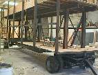 Frames are made for the trailers - a float may have as many as five trailers, each 25' to 55' long. To make turns easier, some floats have cables which make the rear wheels steer in the opposite direction as the front wheels. This frame is then "bucked" with wood studs to form the float, then covered with a "skin" of plywood, canvas, urathane or a combination of the three.