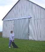Dolores Williams in front of the barn that Germans built. "When they finished the framework, they put a sapling on top, to suck the strength of the sapling up through the framework and give the structure its strength - it was an old German tradition."