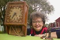 The men gave the Dolezal family a pendulum clock they bought from a prisoner who made it out of wood, string and cast metal. They also gave them a small, hand carved, wooden statue of a man shoveling dirt, with the letters "P" and "W" painted on his trouser legs.