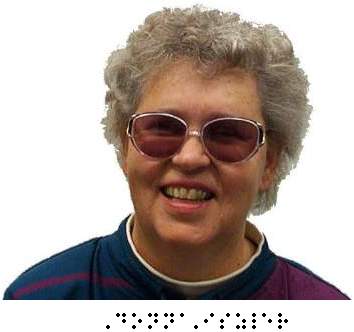 When she isn't at a piano, or church organ, or riding to a student's home for music or Braille classes, or spending time at home with her husband, she sits at a computer, communicating with the sighted world. She types on the keyboard - the monitor turned away from her - and a digitized voice recites her strokes as she writes reports and correspondence. A Braille reader plucks up small pegs, and she runs her fingers over them to read the text.