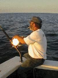 This job is as mystical and serious as finding the fish. Briggs uses two methods; trolling and chumming. Trolling requires a "squid rig" of several rubber squids - each a foot long - hung like a large windchime from a swivel. The last squid is the stinger and has the hook.