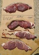 Sample steaks from four tuna and a core sample help buyers grade tuna fish for the Asian market. The bottom fish (notice the lighter color, representing a higher fat content) will fetch the best price; at this time of year (July) from three to four dollars per pound.