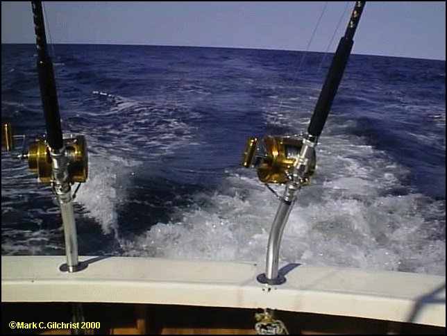 Captain Briggs uses Penn 130 reels; beautiful, huge machines made to pull in fish well over one thousand pounds. My job when one of these starts to sing is to immediately reel in the three empty reels and toss the fifteen-hundred dollar rigs on the deck as Captain Briggs starts and positions the boat. By now the tuna will have pulled out a few hundred feet of line so fast that the clicking of the reel's mechanism is now a "ziiiing!" a sound that could pull any fisherman out of the deepest coma.