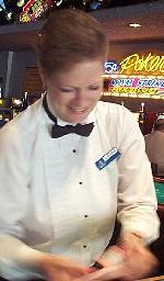 Voelker not only deals 21, but also roulette, craps and Bacarat. Her favorite game? "Craps!" This is the game played on a long table, with rolling dice. "You get to work on a team," she says, "and I get to be the girl, and I get to be the star." She doesn't mind splitting her tokes with the team, because she likes the action - and the glamour - of craps.