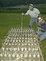 8:27 - The rains come. The annoying kind - just a slight drizzle. Enough to dampen the shells and fuses, yet light enough to keep the show on. We place Visqueen over the small finale' stages and place sheets of thick, black, roofing rubber under and over the boxes of bombs. Mike secures sheets of aluminum foil at the larger finale' stage, individually crowning each large, preloaded mortar.