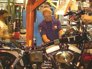 The final assembly is performed using two methods. The Soft Tails, the Dyna Glides and the FL class bikes are made on the "Dyna" line, where Snyder works. This line runs on a team concept started here in 1992, making the Sportsters, and shifted to the larger bikes when assembly of Sportsters was moved to Kansas City earlier this year.