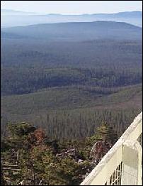 There is danger in working a fire tower. Lane is isolated, and between her and help is 16 miles of washboard, dirt road and sheer-edge switchbacks. There are cougar and spiders and other scary things in the dark. There is heavy wind, and lightning, and, of course, there's fire. Lane has four escape routes off this mountain; if she can't drive down the road, she has established two foot escape routes, and should those become "hot" there is a helipad thirty yards from her tower. It is a rugged life, "but," she says. "If you love the land, how can you not adapt?" Lane loves the outdoors with a passion, and she loves this area. "This is one of the few spots on Earth that hasn't been destroyed by man," she says. Indeed, in her entire view from the tower, she can barely see a building or road.