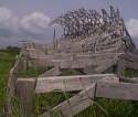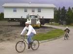 It's the craziest thing. Devil's Lake, in northeastern North Dakota is getting larger every year. Something about the water table and underground springs, but the water level has been rising for decades. They measure the level in feet above sea level, and report it on the radio like the weather, as in "today the lake is at 1447.1." That is an unbelievable 27 feet higher than six years ago, says Chuck Soderstrom, who lives on the lake, and it has consumed nearly 90,000 more acres. He has moved his house uphill once already (I stood in his old front yard to take this photo)
