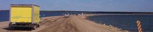 The Corps can't divert the water, as that would send it to Grand Forks and Winnipeg - and they sure don't want it. So they first build short, rock pile walls along roads that are about to be washed out. Then they fill in the walls with dirt as the water rises, then, when the water creeps over the wall, they fill in the road and call it a levee. All these men with their dump trucks can't seem to quell the spirits within the devil's lake.