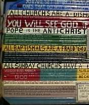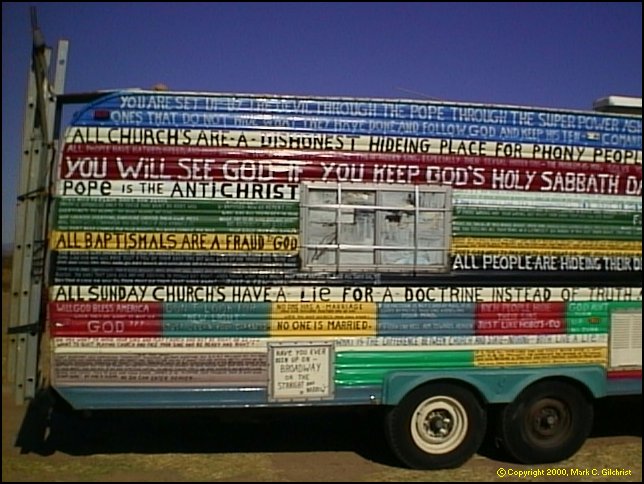 Well, I guess this guy is some kind of poet, only he gets the words from "the man upstairs" and he writes them down for him. I choose not to get into the sexist thing with him (God is a he?) when he claims to have actually copyrighted his work - an impressive feat for any writer... "Isn't that stealing?" I ask. "I mean, you didn't author the poems, you just held the pen while the man upstairs wrote the words, right? Aren't you ashamed of yourself?" "I never thought of that," he says, trying to squeeze a smile through his helmet. I get on my bike and take off before I realize that I probably should have gotten his autograph. I mean, wow!
