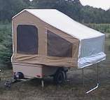 Make: Kompact Kamp Weight: 300 lbs. Year: Late 1980's Specs of current model: Sets up in 2 minutes (I can have mine up in less than 1 minute) 260 lbs., 4'6" x 6'6" bed, 6'4" interior height. Notes: I have this rigged up with an electrical inverter and a small desk and chair. I can work inside of it for hours and hours, and it is where I do most of my writing and web site design. It's really cramped in here, but it's home, and when people offer me a spare bedroom or (ugh!) couch, I ask them if I could just borrow their driveway! In case you're counting tires, I replaced 4 on the trailer, for a total of 12. |