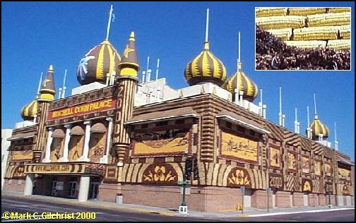 At first I thought "ho-hum" - about the "Corn Palace" in Mitchell, South Dakota, but it grew on me. This city auditorium is covered with corn, and it looks different each year, after they tear down this art-facade (birds help) and create a new design after harvest. They've been doing this for about a century, spending over $100,000 each year and using 21 varieties of corn and wheat products. I sure wish my town had one of these, wherever my town is these days.