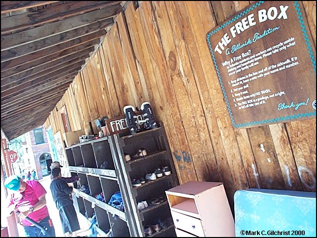 Free For All - In Telluride, Colorado, there is a setup of large cubby boxes just off Main Street. They call it the "Freebox" and people just leave stuff there, rather than be bothered with a garage sale. Somebody sorts it out neatly and cleans it all out each week, and other people just take what they need. (The man in red just scored a nice bicycle pump.) With reserved mirth, I wonder just how this would work in, say, Miami, where not only the clothing and goods would be quickly loaded into a van, price tagged and set on tables at the nearest flea market, but the large wooden structure would probably go with it?