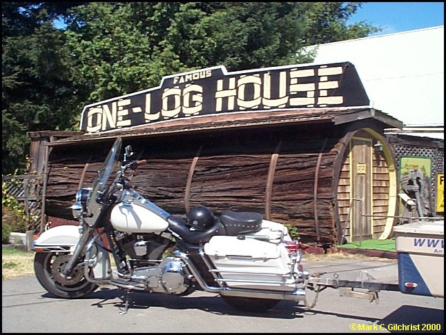 REDWOOD FOREST, NORTHERN CALIFORNIA.The house is made of a single redwood log. The bike is made of a lot of steel.