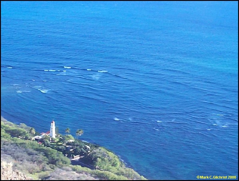 A lighthouse on the southeastern shore of Oahu, from atop the Diamondhead crater.