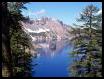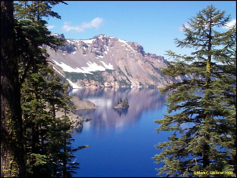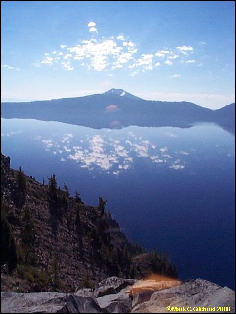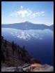 SHIP ISLAND can be seen, near the far shore of Crater Lake. They named it that because it looks like a masted sailing ship -- you have to get a little closer to make it out...