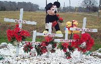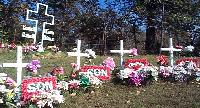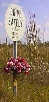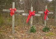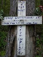 These rustic, bare-wooden crosses were erected after an accident on March 2, 1997. Though the writing in marker pen is fading, the ribbons and flowers are fairly new.