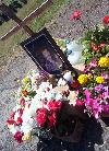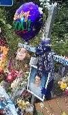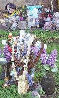 It was eerie finding two young men with such close names within an hour of each other, but then, this whole page is eerie. Mr. Thomas' friends are pretty resourceful; since he had left them in front of a store, with only pavement all around, someone built a wooden box, and they propped a cross and large photograph on it. The flowers are all potted, and there is bottled water tucked in the back. I can just see someone coming by each night, turning the box over, putting the cross, plants and mementos (stuffed animal, rolling papers) in the box, and putting the whole thing away for the night.