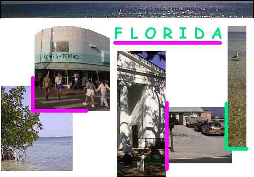 (Clockwise, from lower, left, below the sea): Mango trees on Lake Surprise near Biscayne Bay and the Florida Keys. ::: Miami Beach, where the elite meet to greet in the heat. ::: A church in Appalachicola, which was shipped to this panhandle city from New England. ::: a gull wading off of Tavernier Key. ::: Talk about living on the beach, this guy's front lawn, driveway - and surely his living room - are all sand!