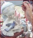The procedure to repair most items is pretty straightforward. First, Mirzaynts cleans off any old glue, and then he prepares and glues together broken pieces. "Use only a little glue - you don't hurry," Mirzaynts says. Sometimes he drills holes in the pieces and inserts pins for support, "like rebar in concrete," he says. He then fills in gaps using an epoxy resin, and actually reproduces some broken or missing pieces, such as a hand from a figurine. He wet-sands the item and refills where necessary. His tools are often diamond-tipped, for clean cutting and efficiency. He then paints the item, carefully matching the colors, and glazes the work to finish it off. The finish part of his work is similar to automobile body work, another job he once held here.