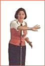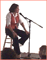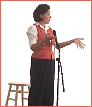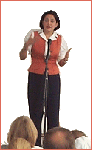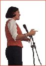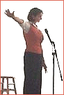 who follows her own tune. You won't hear music during her set, but her body sways and bends and rises, and it nearly talks, in complete animation with the story. Every move is choreographed and helps bring the words to life. If she were a TV newscaster, she might just throw the copy down, and show the audience how; "three" (holds up three fingers) "firemen" (rugged, brave expression) "with their long hats and heavy coats" (hands actually draw a fireman's hat and bulky coat) "bravely carry" (arms holding something large, shoulders showing the weight) "three innocent" (face showing helplessness) "flaming" (hands flare up) "fajitas to their table at the Mexican cafe." (deadpan face.)