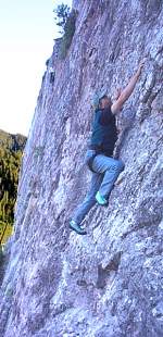 I look around, decide on another approach, and crab to the right, like a window washer swinging to a new pane. It doesn't look much better over here, but I have a new attitude. That place to my left was a dead-end, it was all about failure, and it was about to be all about quitting. Now I'm on new ground, with a fresh start. I rosin up my hands, and I focus on the rock before me, tuning out everything else. This still is not easy, and it takes me several minutes to find a single, feeble hold. I hug the wall as if I had some weird affection for the thing, and I run my fingers over the face, feeling for a crack, or a node - just a small knot in the rock. I manage to get each hand onto some small purchase, and I begin a search with my feet. My climbing shoes hurt like Hell, but they have sharp, solid edges and can - will - give me the grip I need.