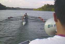 If you are not working your stroke perfectly, don't worry. A little voice will tell you what to do. That voice comes from a small loudspeaker in the bow, connected to a microphone in the stern, on the head of the coxswain, a team member selected for his or her small mass and large ego.