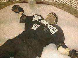 Follow me, here. Now, I finally have the puck! All I have to do is figure out a way to get it from my right foot to the goal. I get my stick to the ground just as nine guys charge me. Somehow the puck meets my stick and I give it a great slap - about a yard or so - when Paul picks it up and backhands it to Keith Quinton, who passes it to Joe Tuesch, who I think actually gets it in the net! This could be called an indirect assist of the third part for me, and in my book, that's a goal!