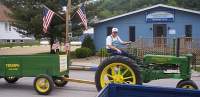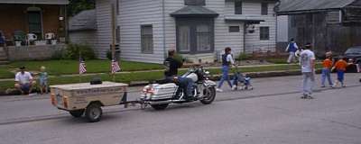 I decorated my trailer with a few flags, and wore my True America T-Shirt, which has a photograph of an American flag that had actually been flown over the White House. My rig and I were pretty dressed up, and we were ready to go when the music started. The procession rolled out of the parking lot, and down Buell Avenue, then took a left turn down Main Street. People lined the streets - some came out in their front yards and waved to us as we passed. Some sat on their front porches, and some just peeked out their windows. Parents pointed to things for their children's benefits, and vice versa, and kids strayed out into the street in hopes of frightening Mom and Dad. It was truly an all-American, family day.