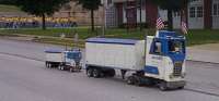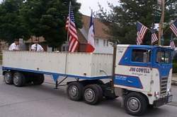 A highlight of the parade - for me, at least - was the set of miniature trucks. There were three of them, made like the large, cab-over tractor-trailier rigs we thought would take over the industry in the seventies. Made by Jim Cowell for parades, the largest was only six feet tall, and could hold a dozen people in its trailer. The second was about four feet tall and driven by a young boy, and the smallest was only a few feet long, towed behind the middle truck.