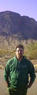 The sun is setting on this side of the rock and it is beautiful, with a spansive vista below - it is like watching a sunset from a low-flying airplane. I figure I have about an hour of light left. I hadn't really decided to climb in the dark, but it looks like I may have to. The ranger gave me five hours for this trip, but that's probably a long-shot - for elderly with children or something - and I figured I could do this in half that time, maybe, and it looks like it will be dark before then. I finally start climbing up again. Then, I have to work my way around a bowl and take some treacherous steps up the side of a rock wall. This is all with the help of cables and bars and even steel ramps secured to the rock, but it is still a hefty climb. This stuff looks so old, like World War II vintage, and I feel like I'm attacking Sicily or something. After the climb up Etna, I lose the trail and wander to the right, along the back face. This takes about ten minutes before I decide that I am real lost. This mountain (there I go again) is filled with false trails that people - lost, like me - have made. In fact, most of the trail markers are here to keep you off of these false trails and off paths made by washes from heavy rains. I realize I am lost because my right view takes a sheer dive about 200 feet and my left view is solid rock wall. This is the first time I consider the option of panic. Partly because I am just a stiff breeze from tumbling to a mangled death and partly because I am freaking lost and I may not make it to the top by sunset. I resolve that, if I do not make it this time, there will be no more Picacho - I've had it with her. I am determined to get up there today, but I realize that this mountain - excuse me, but take a look down from here and tell me this is no freaking mountain - could kill me. Why the heck do they call it "Picacho Peak" anyway? "Picacho" is Spanish for "peak" - this is crazy. I don't argue this point right now, I just very carefully turn around and backtrack for a while. I find the trail - it goes up along the front face, and is just a gradual climb, like having a par three on eighteen. I practically break into a sprint, and at 5:06 p.m. I am at the top - not just at the top of this stupid mountain, but on top of the world!
