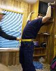 Benny Sherman will teach the course today and first, he shows us how to fly. In the classroom, he gets us to arch our backs and hold our arms and legs out. Keeping an arched back is important because it keeps us with our parachutes up and our eyes down. We practice this several times.