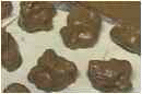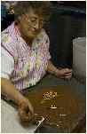 She pulls three or four peanuts from her pile in the chocolate, and clusters them on the table, then she scoops some chocolate in her hand and pours it over the peanuts, lets it cool, and places it on a tin sheet covered with wax paper. She will put 63 clusters on each of 24 tins today, dipping over 1,500 pieces of candy, with just a few of them missing the tin and landing in her mouth.